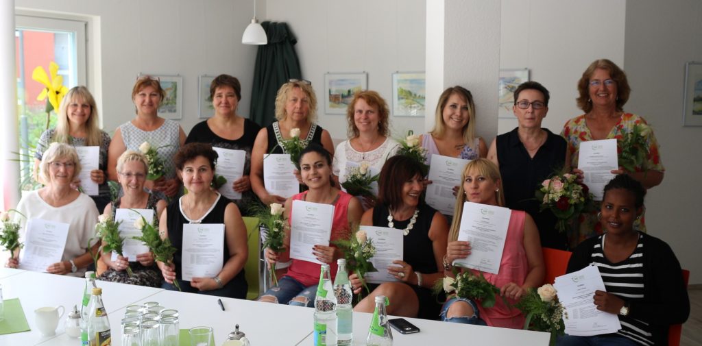 Zum dritten Mal fand in Kiebingen im vergangenen halben Jahr ein Kurs zur Qualifizierung als Alltagsbegleiterin in Pflege-Wohngemeinschaften statt. Am 23. Juni konnte nun Frau Andrea Orth, Referentin der Katholischen Landfrauenbewegung Freiburg, 13 Frauen das Zertifikat für die Basisqualifikation zur Alltagsbegleiterin überreichen.